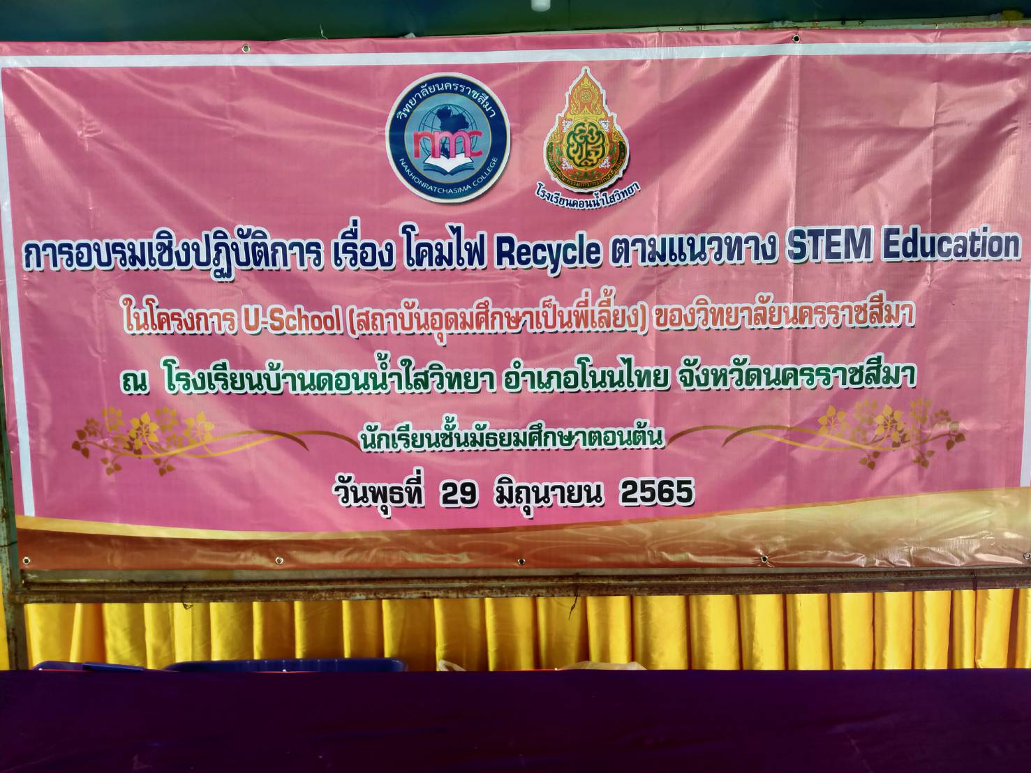 วันพุธที่ 29 มิถุนายน 2565 โรงเรียนดอนน้ำใสวิทยา จัดการอบรมเชิงปฏิบัติการ เรื่อง โคมไฟ Recycle ตามแนวทาง STEM Education ในโครงการ U-School (สถาบันอุดมศึกษาเป็นพี่เลี้ยง) ของวิทยาลัยนครราชสีมา สำหรับนักเรียนชั้นมัธยมศึกษาตอนต้น ณ อาคารอเนกประสงค์ลิ้มวิไล |