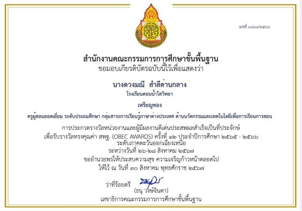 เกียรติบัตรเหรียญทอง OBEC Awards ระดับภาค
